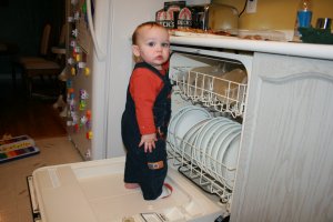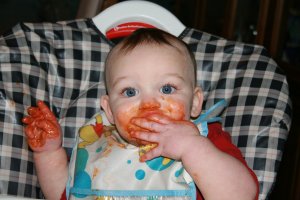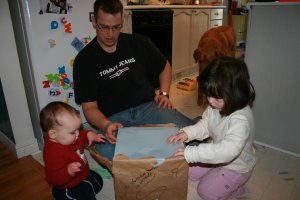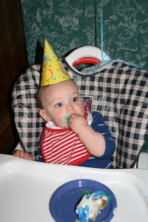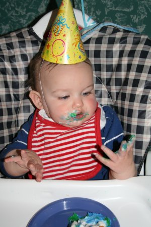 Opening a birthday package from PEI. Reegan seems to know a lot about how to do it. |  So this is my 1st birthday and I'm trapped in the high chair. |