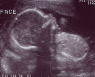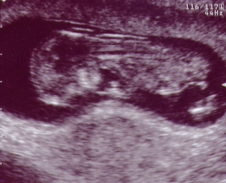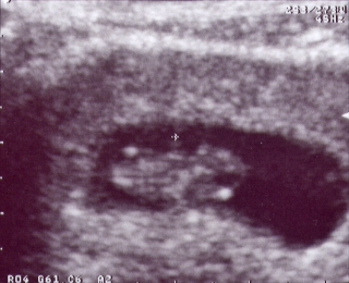 Here's my first picture. The technician is estimating that I am 8 weeks along at this point. I'm pretty small, but I'm growing fast. |  This is me at 12 weeks. Now you can see some of my body parts. It looks like I'm upside down because I am facing Mommy's back. I was too camera shy to turn around. I am just over 6 cm long -I still have a lot of growing to do to catch up to my big sister. |