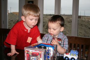 Curtis is interested in my new toy. |  Playing with Mr. Potato head. They look better on me. |