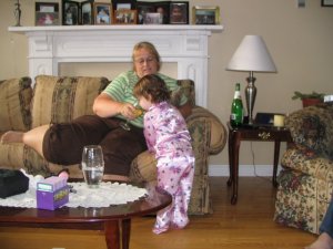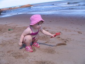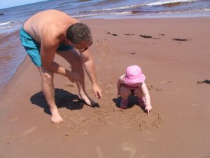 I don't want to sit down and get my bikini dirty |  Grampie's teaching me how to write in the sand. |