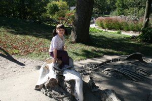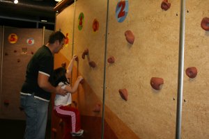 Sitting in the wooden canoe. |  Daddy's helping me climb the rock wall. |