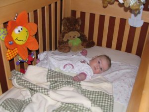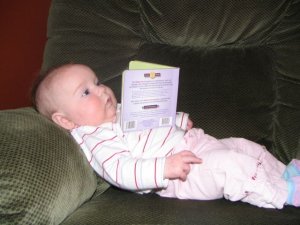 I'm bored!! Maybe I'll lie down and read a book. |  Mommy, this isn't funny. My legs are really stuck out the side of my crib. |