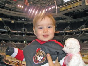 What did you say was on my eye? Cheese? |  Here I am at the Corel Centre getting ready to watch my first Senators game. We had to buy lambie a ticket too. |
