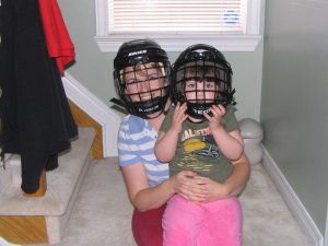 We took the same picture over two years ago - I was a little smaller then. |  NIght before my first skating lesson. Mommy and I act silly with our hockey helmets. |