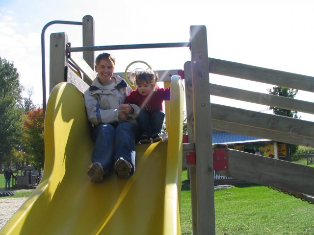 Going down a big girl slide with Mommy. Wee!