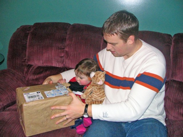 Me and Daddy opening a package from PEI.