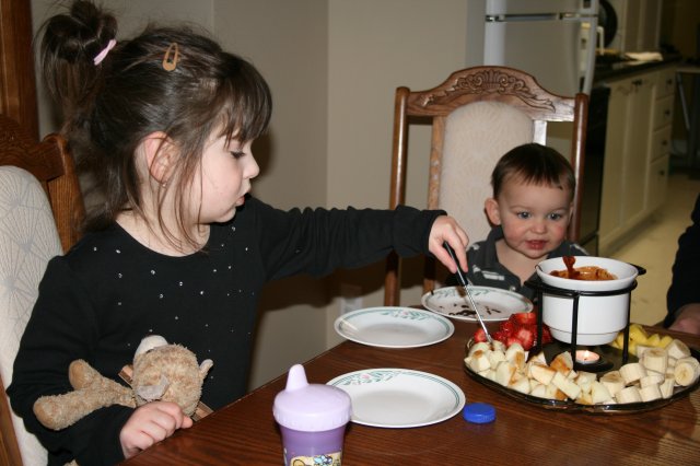 Having a romantic fondue with Mommy and Daddy on Valentine's Day.